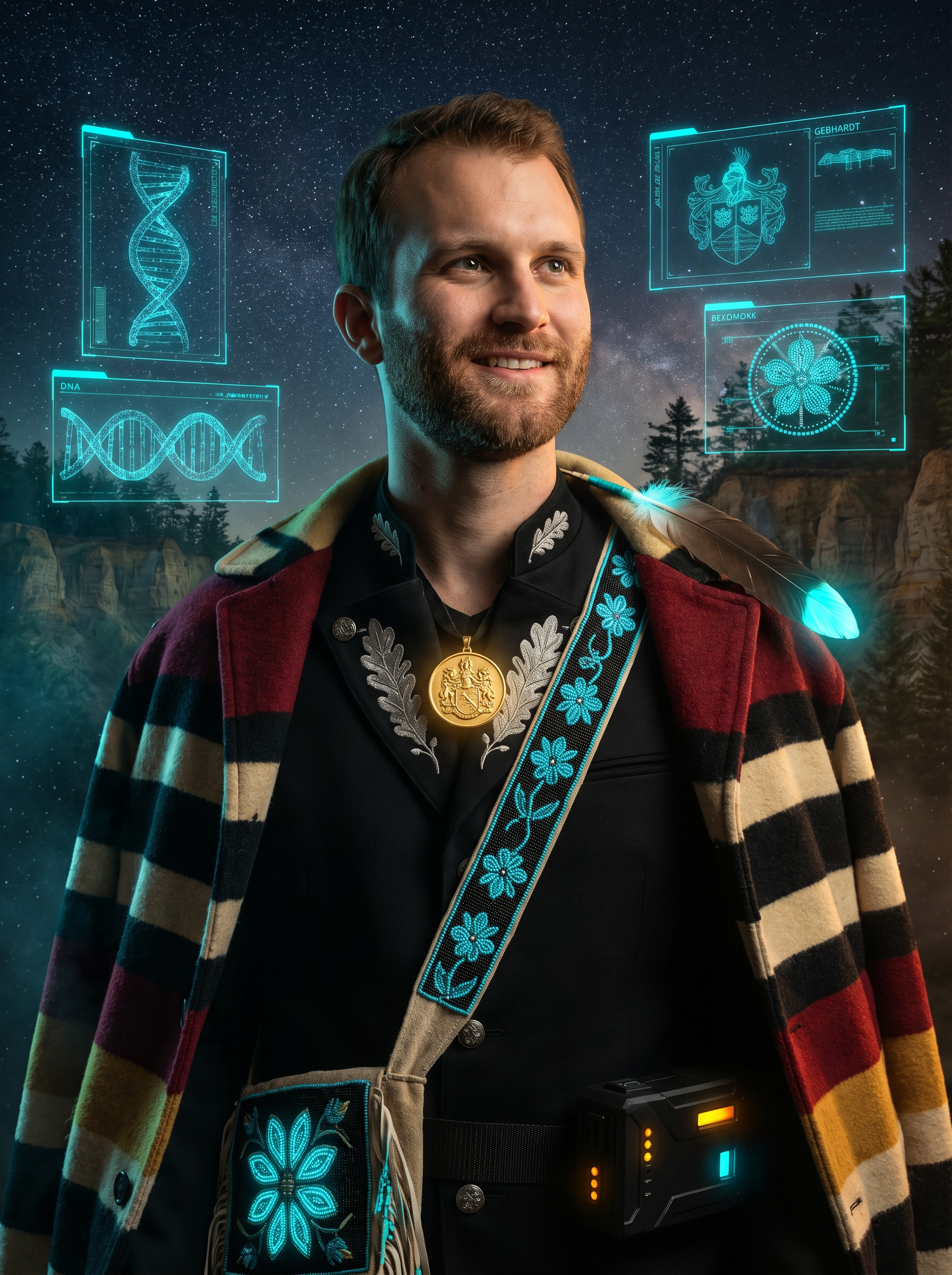 Ryan Hooks — founder of Proto™, operator portrait with astronaut utility pack and Hooks + Gebhardt lineage regalia